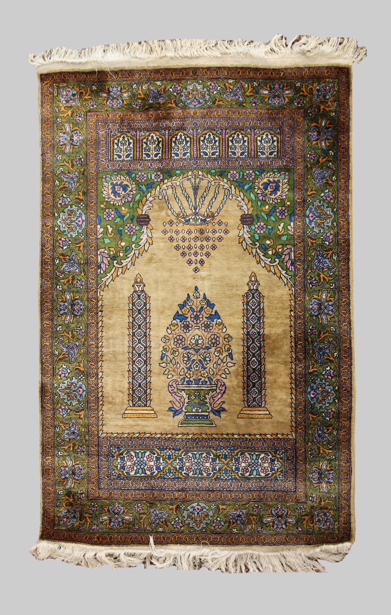 TAPIS de PRIÈRE d'Orient en laine et soie à fond beige à décor floral stylisé. Le centre orné d'une "porte du Paradis" centrée d'une corbeille fleurie entre deux colonnes. Bordure à fond vert entre deux contre-bordures à fond orange.