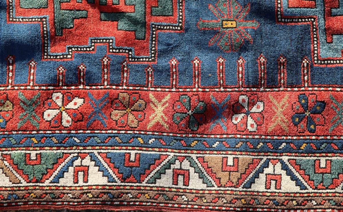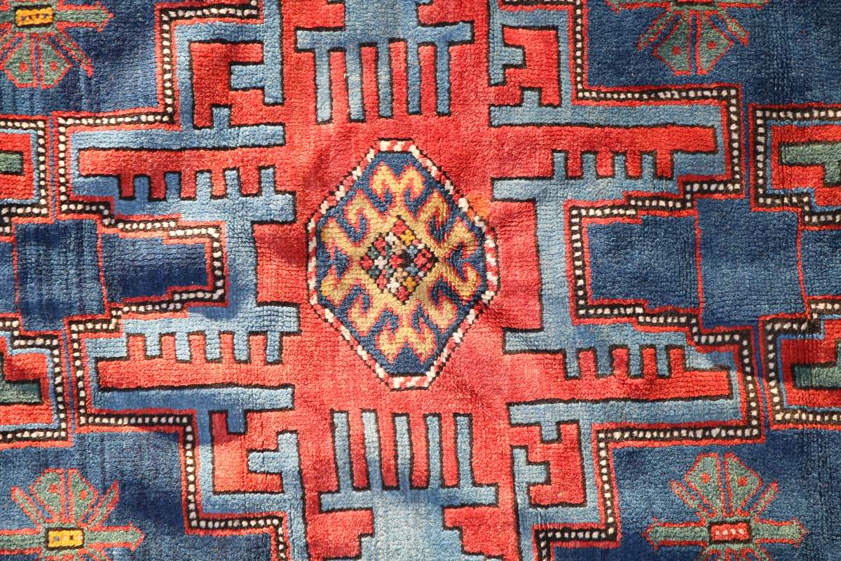 KAZAKH, GALERIE en laine a fond bleu et bordures rouges, aux quatre médaillons centraux aux motifs d'aigles stylisés.