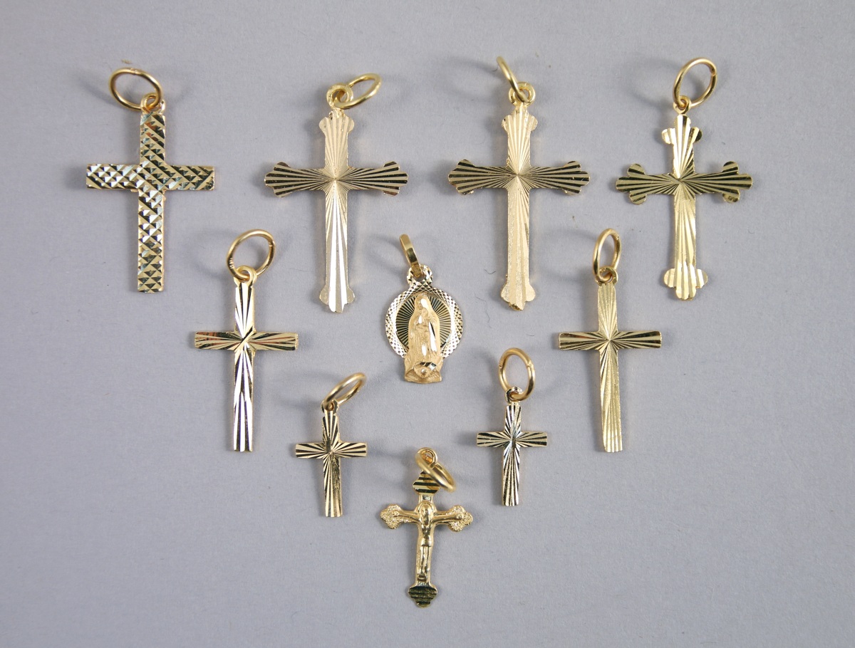 Réunion de 10 CROIX et d'une MÉDAILLE figurant la sainte Vierge en or jaune 22K.