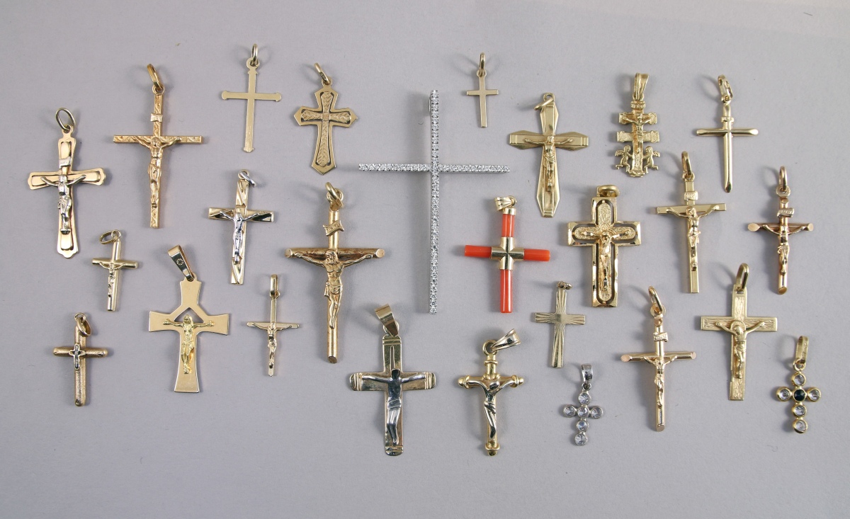 Réunion de 26 PENDENTIFS, CROIX et CRUCIFIX en or jaune et gris 18K. Il comprend notamment une grande croix pavée de petites pierres blanches (Haut. 6 cm).