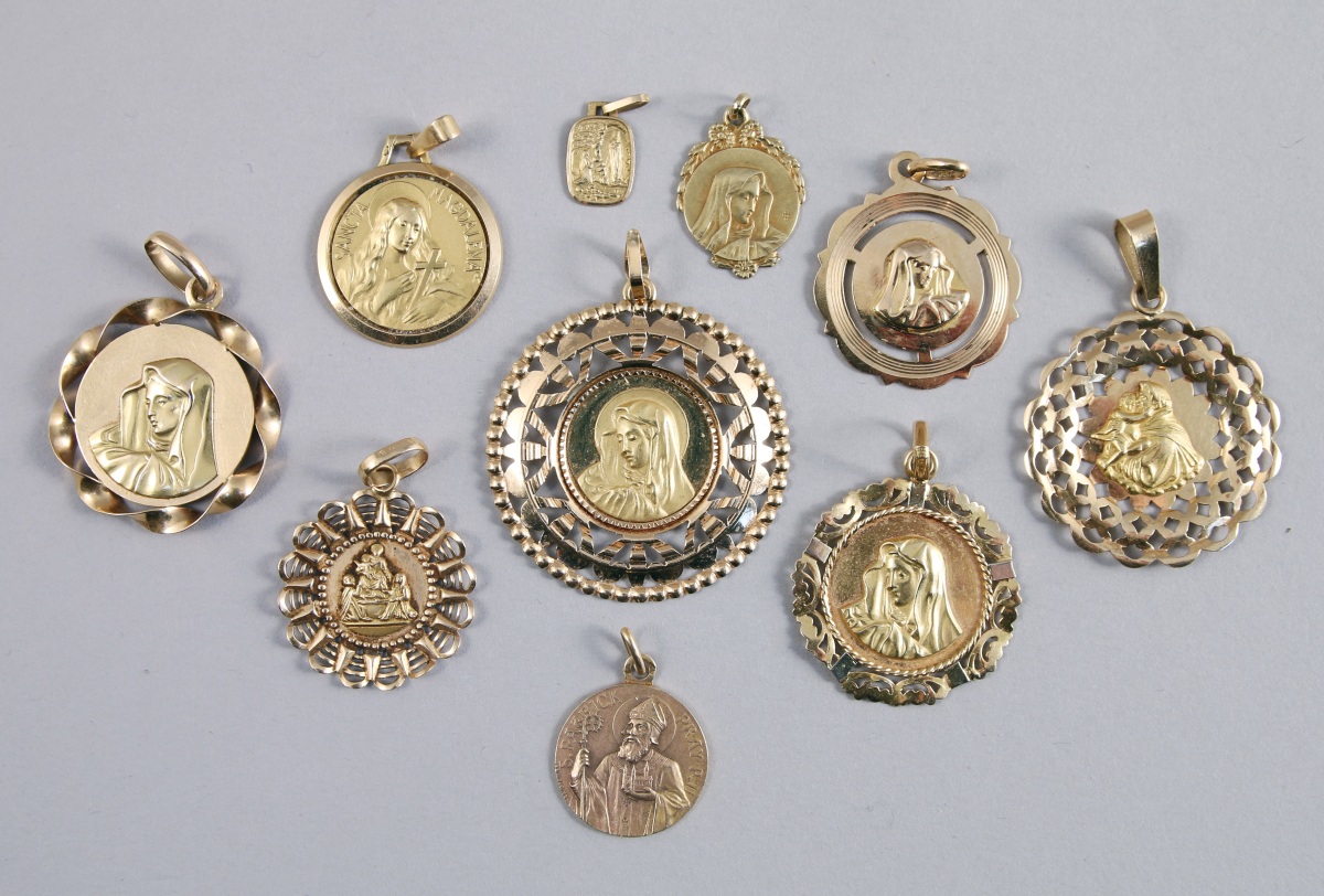 Réunion de 22 PENDENTIFS, CROIX et CRUCIFIX en or jaune et gris 18K. Il comprend notamment une grande croix pavée de petites pierres blanches (Haut. 6 cm).
