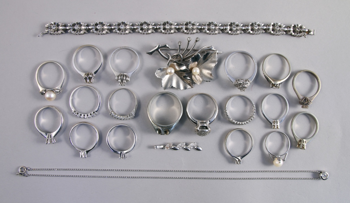 RÉUNION de 22 BIJOUX en or gris18K sertis de pierres ou de perles : 18 bagues, un bracelet, une broche, un pendentif et une chaîne avec pendentif.