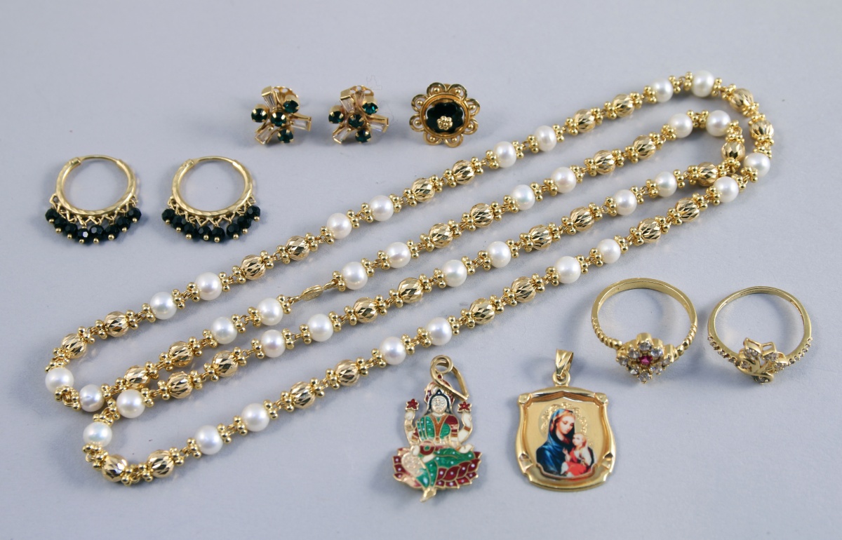 RÉUNION de HUIT BIJOUX en or jaune 22K sertis de pierres, de perles ou émaillés : un collier, deux bagues, deux paires de boucles d'oreille, une boucle d'oreille, deux pendentifs.