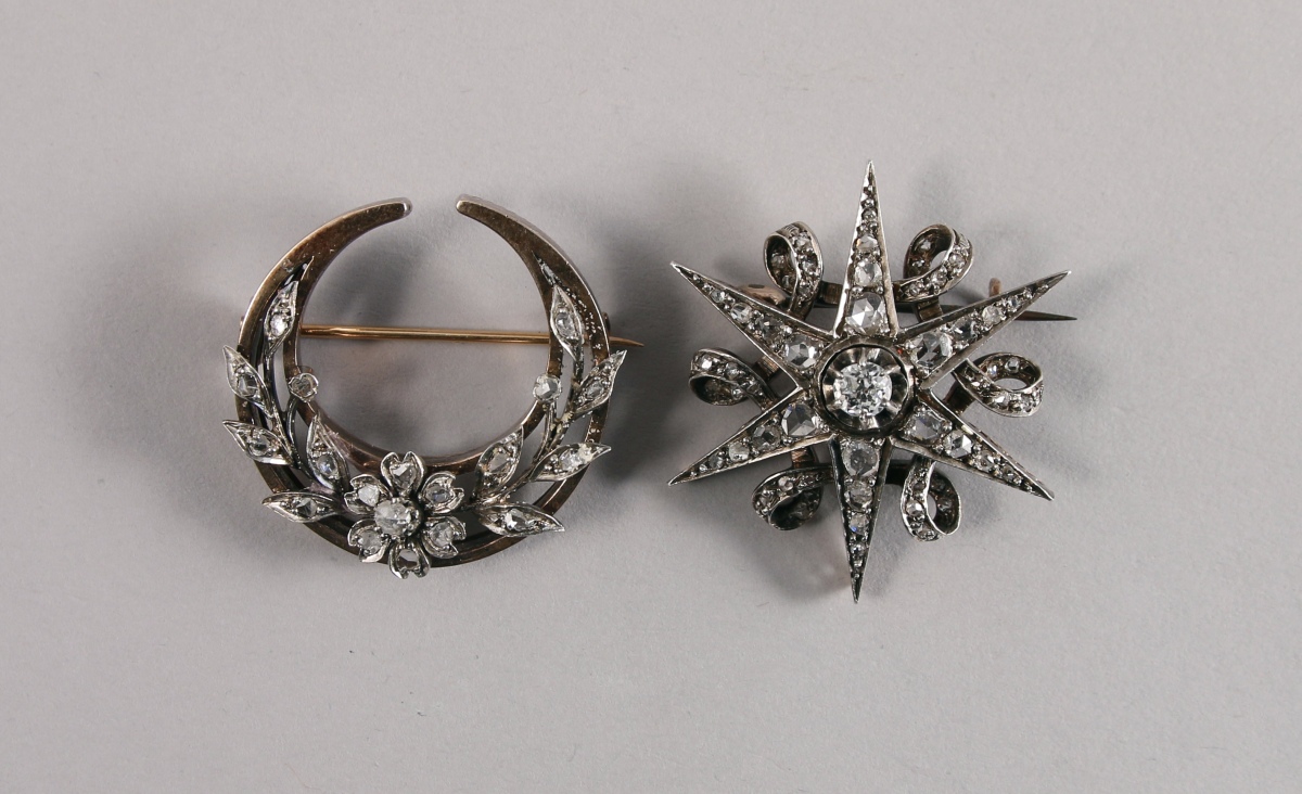 - BROCHE adoptant la forme d'un croissant montant appliqué d'une fleurette flanquée de deux rameaux sertis de diamants taille rose. Poinçon tête d'aigle, fin XIXe-début XXe.