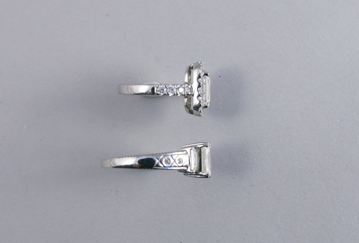 - La première dite POMPADOUR sertie d'une pierre blanche taille émeraude dans un entourage de petites pierres blanches. Huit petites pierres blanches à l'épaulement.