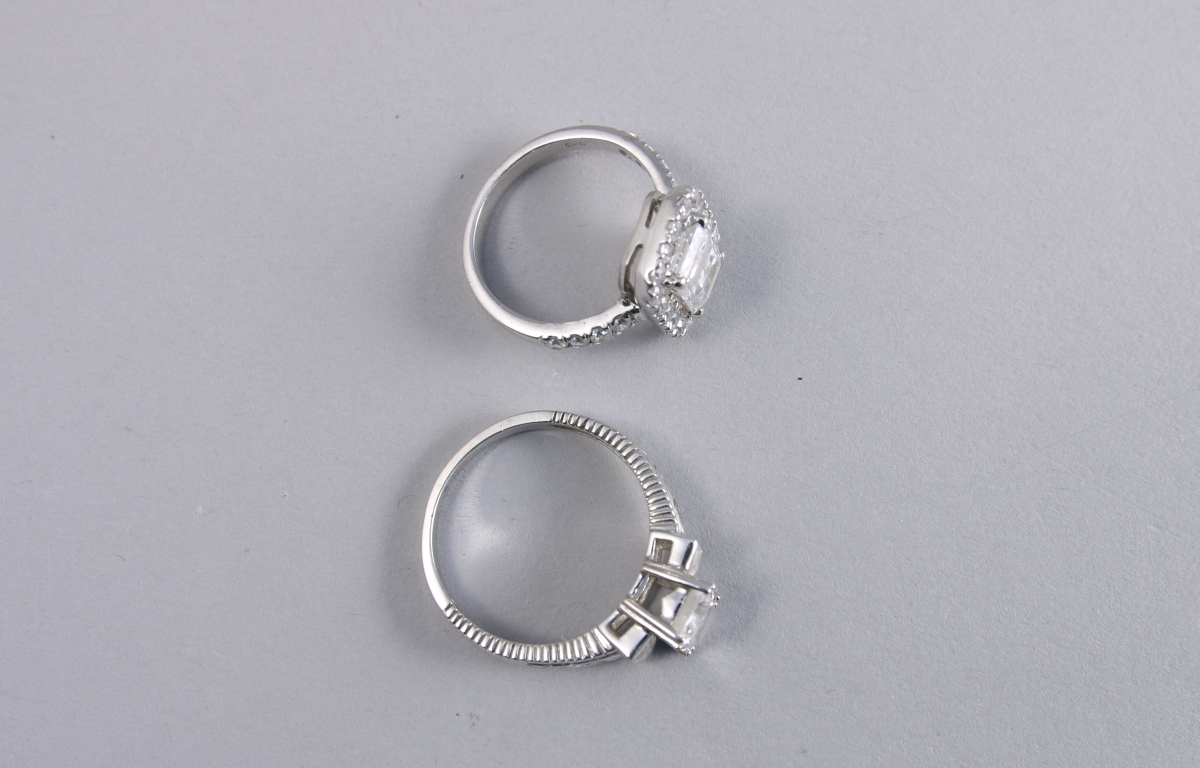 - La seconde sertie d'une pierre blanche taille émeraude flanquée de deux pierres blanches taille émeraude plus petites. Quatre petites pierres blanches à l'épaulement.