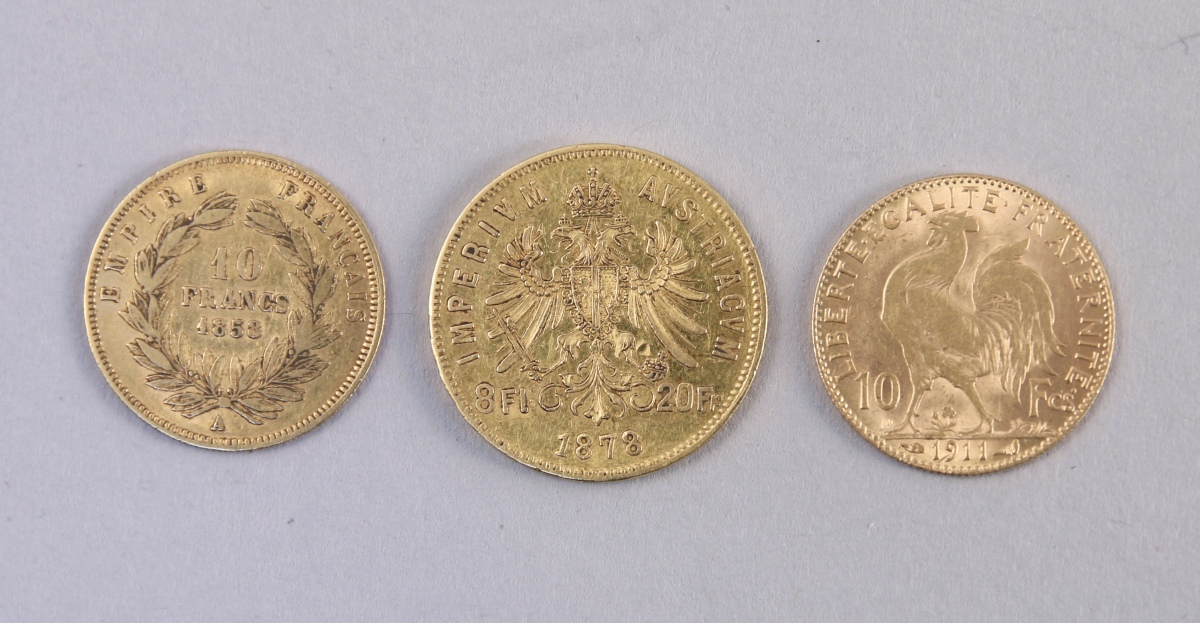 - 2 pièces or de 10 F, l'une à l'effigie de Napoléon III tête nue (1858) et l'autre au coq 1911.