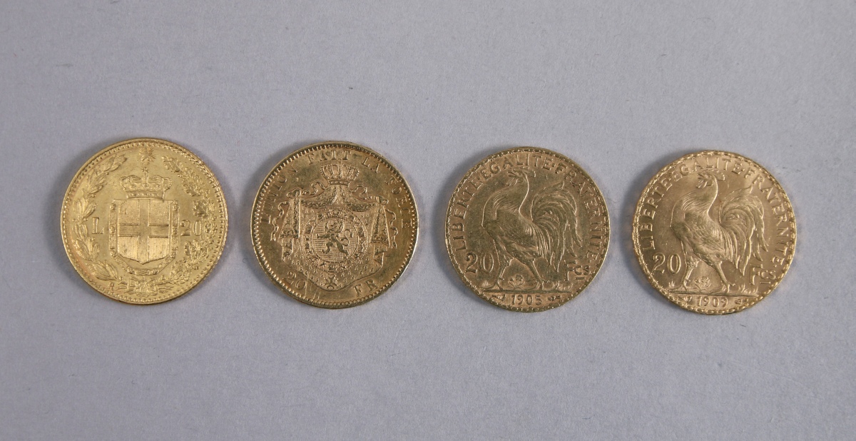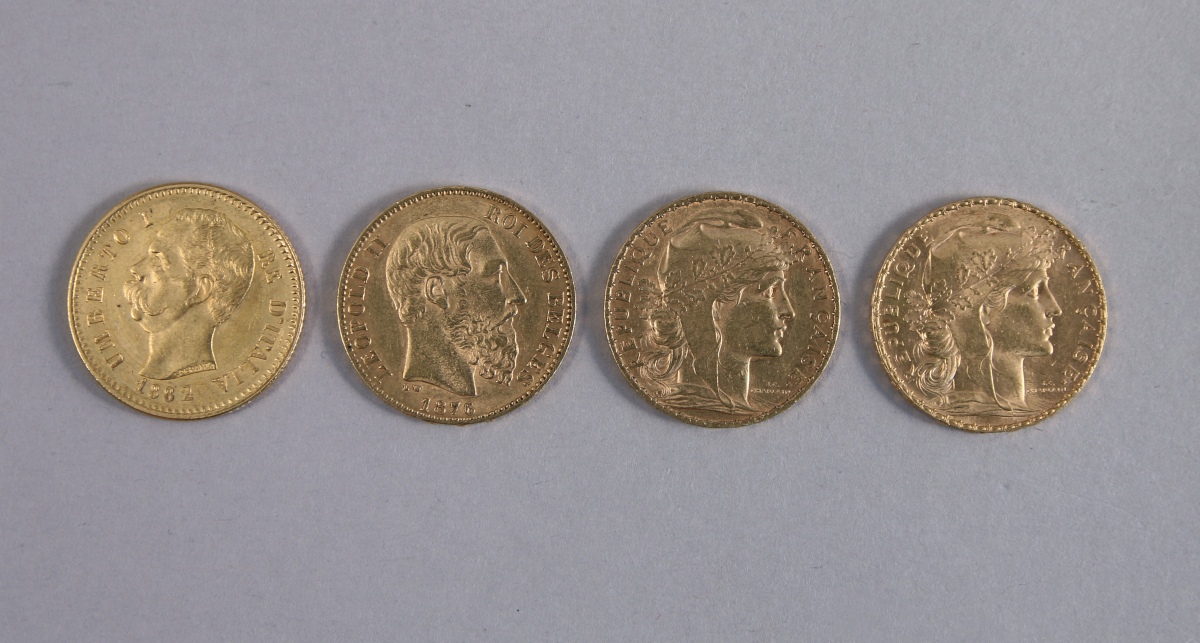 FRANCE, BELGIQUE et ITALIE. 4 pièces de 20 FRANCS et de 20 LIRE or. Modèles Coq 1905 et 1909, Léopold II 1876, Umberto Ier 1882.