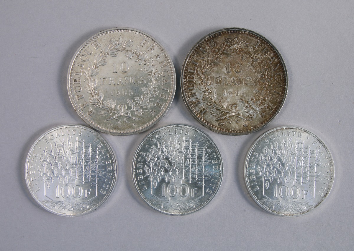 JOINT : FRANCE. 3 pièces de 100 FRANCS argent (Panthéon 1982) et 2 pièces de 10 FRANCS argent (Dupré, 1965).