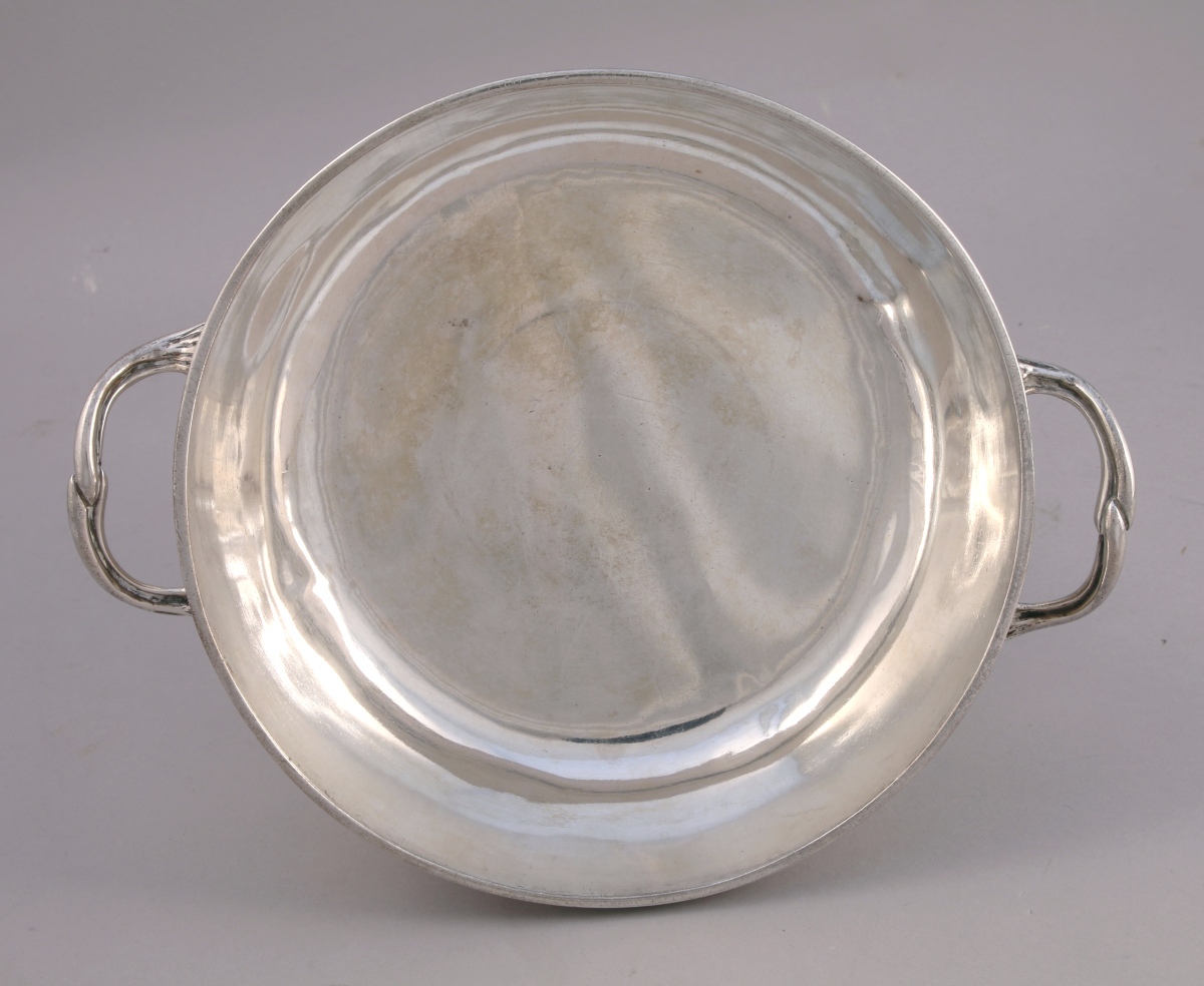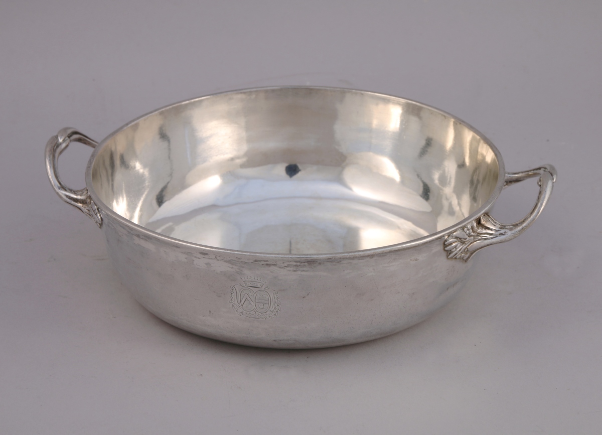 PARIS. LÉGUMIER en argent uni. Anses latérales à attaches feuillagées. Le corps gravé d'armes d'alliances timbrées d'une couronne comtale.