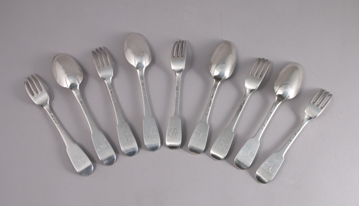 REIMS. RÉUNION de QUATRE COUVERTS et d'UNE FOURCHETTE en argent, modèle uniplat, portant des poinçons aux Fermiers Généraux de la juridiction de Reims. Les spatules monogrammées "RC" :
