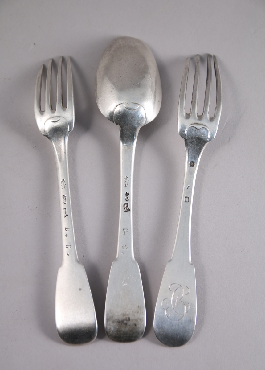 - CHÂLONS-EN-CHAMPAGNE. Suite de DEUX COUVERTS et d'une FOURCHETTE. Manches marqués "PL". Jurande : lettre-date "K", avant 1745 (probablement vers 1740). Maître-orfèvre : C, I, M, une étoile couronnée. Poids : 360 g.
