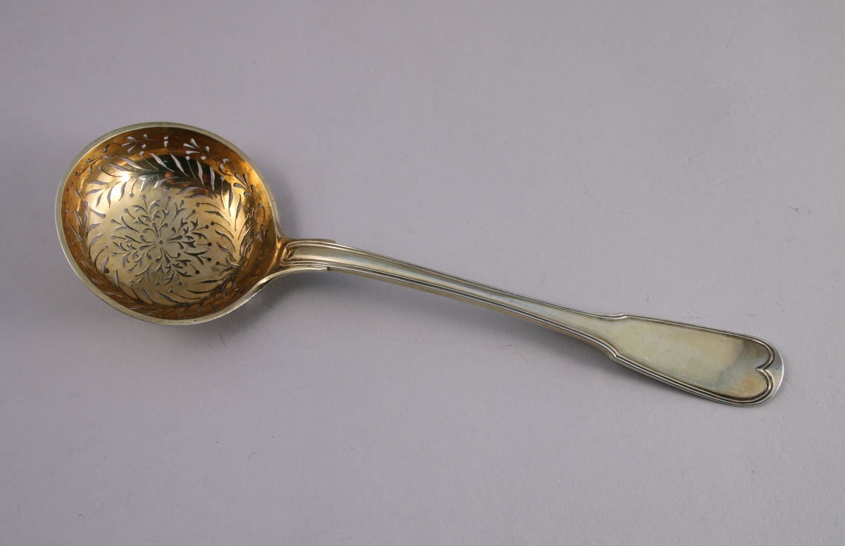 STRASBOURG. CUILLIÈRE À SAUPOUDRER en vermeil, modèle filet-contour. Le cuilleron de forme ronde à simple filet présente un décor ajouré d'un fleuron quadrifolié inscrit dans une couronne de lauriers et bordé d'une frise à palmettes et agrafes.