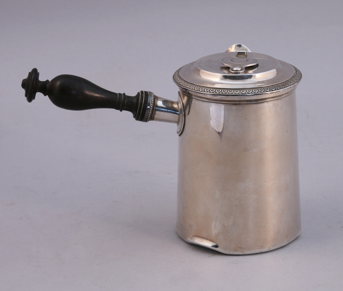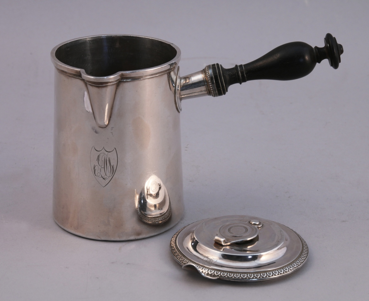 CHOCOLATIÈRE en argent uni. Le couvercle cerclé d'une frise de rais de coeurs. Corps et couvercle monogrammés "AD" dans un écu. Manche latéral en bois tourné et noirci.