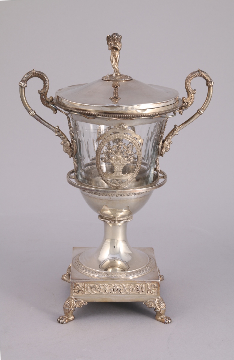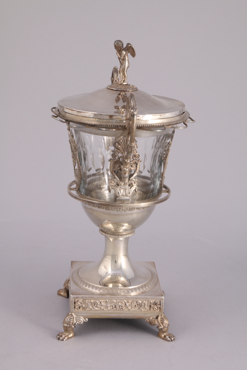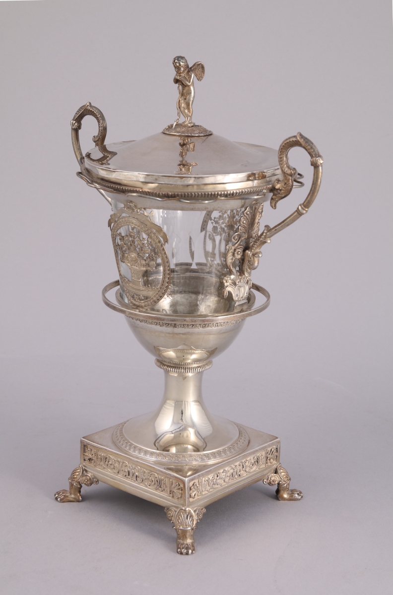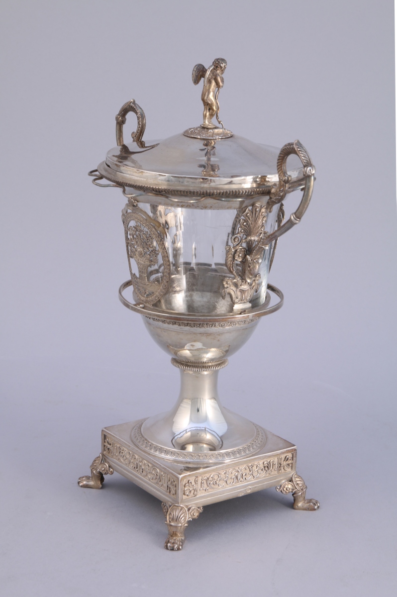 CONFITURIER adoptant la forme d'un vase médicis en argent pouvant accueillir 12 cuillères. Le fretel figure un amour appuyé sur son arc. Le corps orné de deux corbeilles de fleurs inscrites dans un médaillon rubané. Les anses agrémentées de feuilles d'acanthes se terminent par un col de cygne. Attache palmettes. Base de forme carrée à décor de rinceaux reposant sur quatre pieds griffe à large palmette. Réceptacle en cristal taillé.