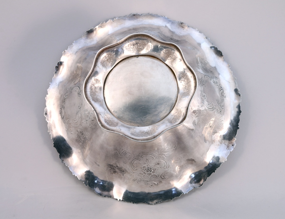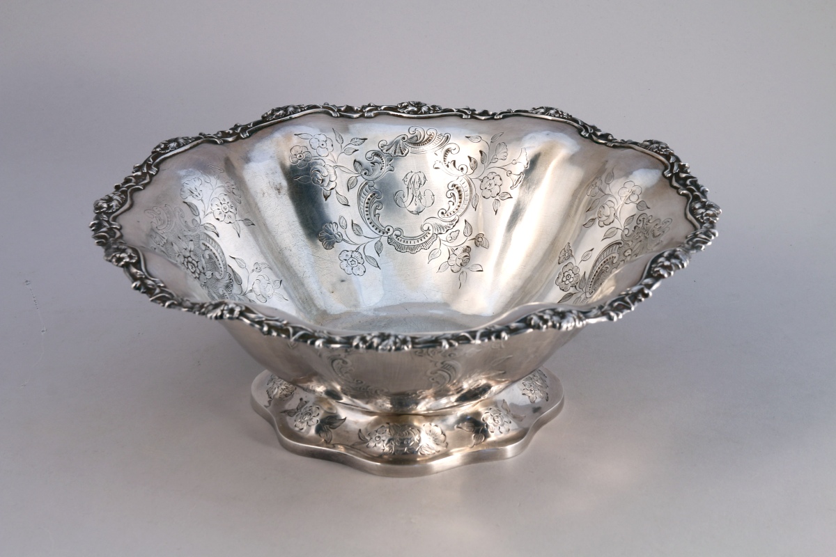 SALADIER à côtes de forme ronde à bords chantournés en argent. Décor repoussé de cartouches rocailles feuillagés et fleuris. L'un monogrammé "LR". Le rebord appliqué d'une frise ornée de fleurs et de feuillages. Pied chantourné à décor floral.
