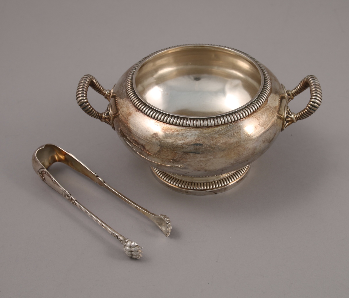 SUCRIER de forme ronde en argent reposant sur un piédouche. Il est orné d'une frise de godron au col et au pied. Les anses latérales à attache en palmette adoptent le même motif. La panse monogrammée "CH".