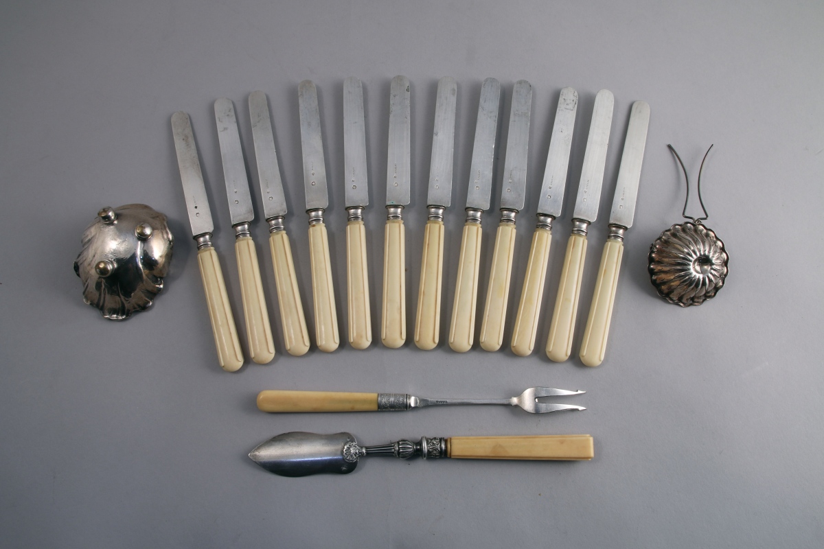 Suite de 12 COUTEAUX À FRUITS, lame en argent, manche en ivoire (elephantidae SPP) mouluré. Lames en argent signées "A. Paul Fes".