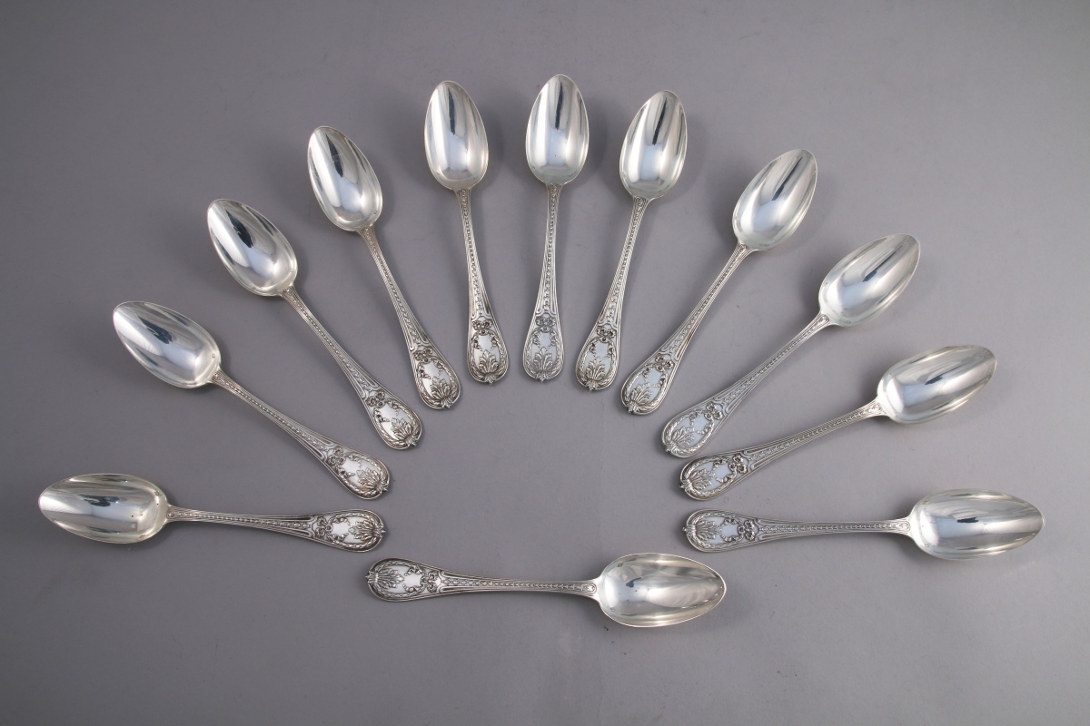 Suite de 12 CUILLÈRES à ENTREMETS en argent, à riche décor d'un culot d'acanthe, fleurons et ruban noué retenant une couronne de laurier. Monogramme "CC".