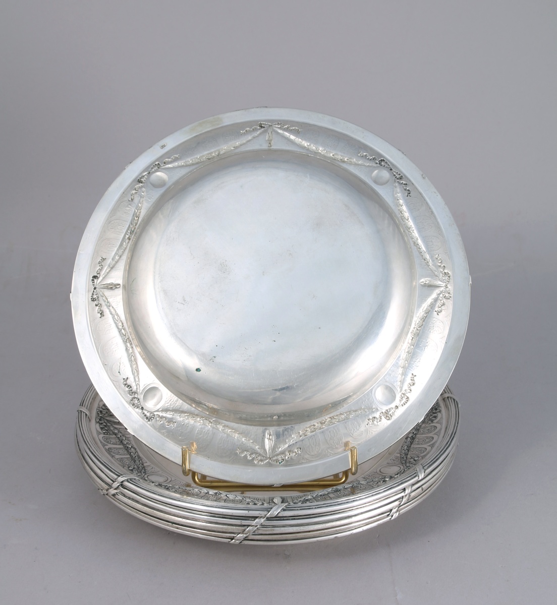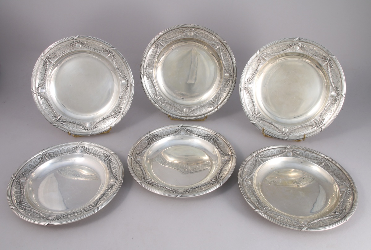 Suite de SIX ASSIETTES de forme ronde en argent. L'aile à décor de guirlandes de lauriers et de médaillons rubanés sur fond de frise fleuronnée. Le rebord à frise de joncs rubannés.
