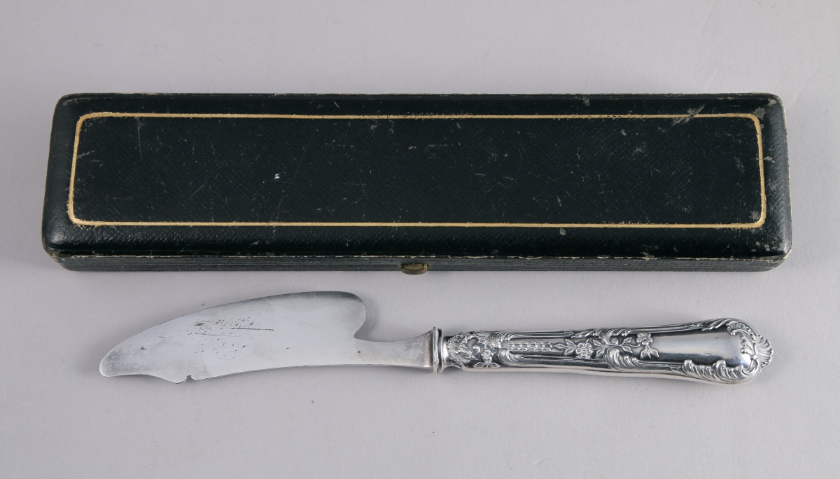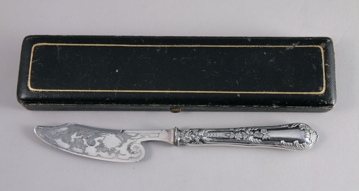 - COUTEAU À FROMAGE, manche en argent fourré à riche décor végétal tel que acanthes et fleurettes. Le bouton en coquille. Lame gravée dans le même registre décoratif signée de l'orfèvrerie Boulanger à Paris. Style Louis XV, fin XIXe, début XXe. Poids brut : 40 g. Écrin.