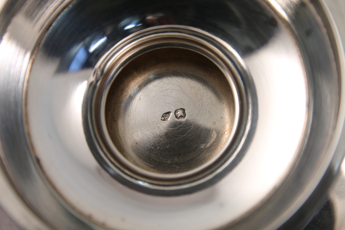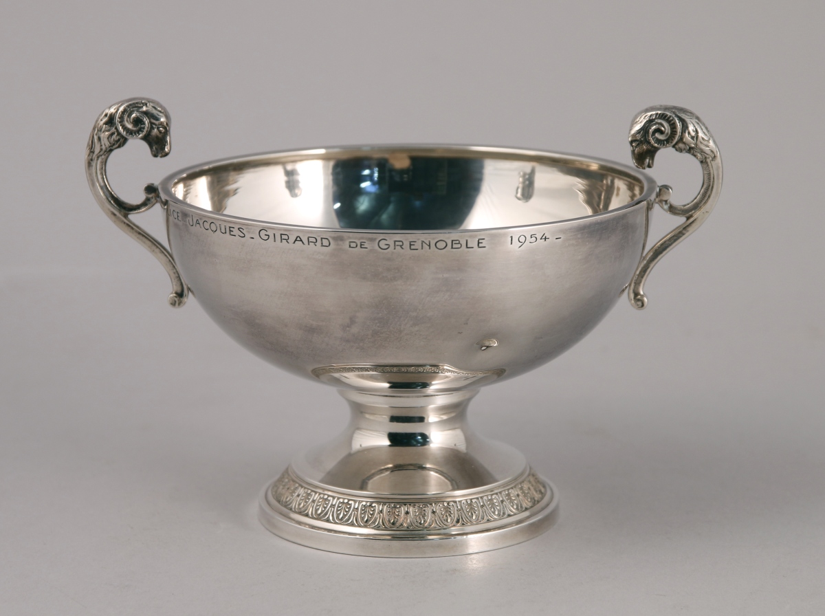 COUPE DE MARIAGE en argent uni reposant sur un piédouche à frise de palmettes. Anses à têtes de bélier terminées par des volutes. La panse gravée " Alice Jacques - Girard de Grenoble 1954 - ".