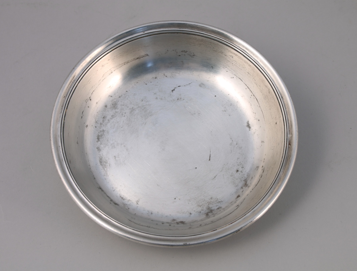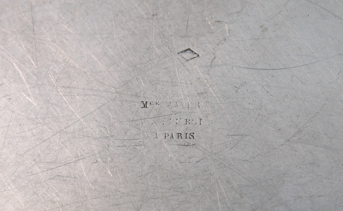 ÉCUELLE de forme circulaire en argent uni. Aile légèrement évasée à filet. Elle est monogrammée "AG" dans un cartouche feuillagé. Signée "M (?) MAYER / ? du Roi / A Paris".