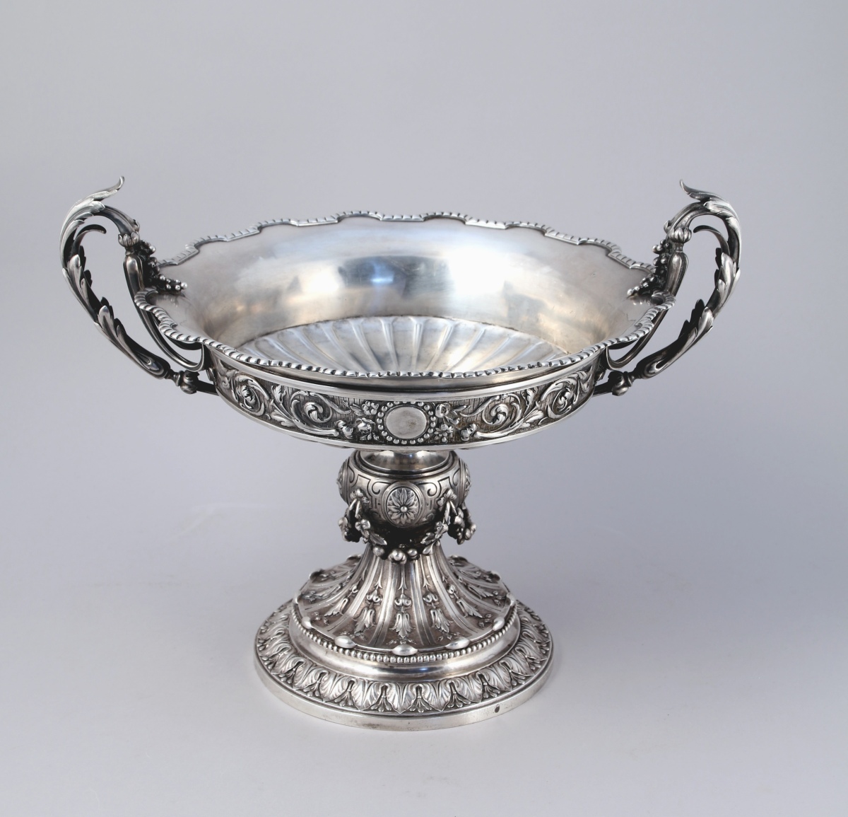 Importante COUPE sur piédouche en argent. Aile évasée à bordure polylobée godronnée. Les anses sont ornées de grappes de fruits et de feuilles d'acanthes. Corps à frise de rinceaux agrémentés de deux médaillons cerclés d'un rais de perles. Piedouche cannelé à asperges sommé d'un noeud fleuronné retenant des guirlandes de fruits traitées en ronde-bosse. Une frise de feuilles lancéolées orne la base.