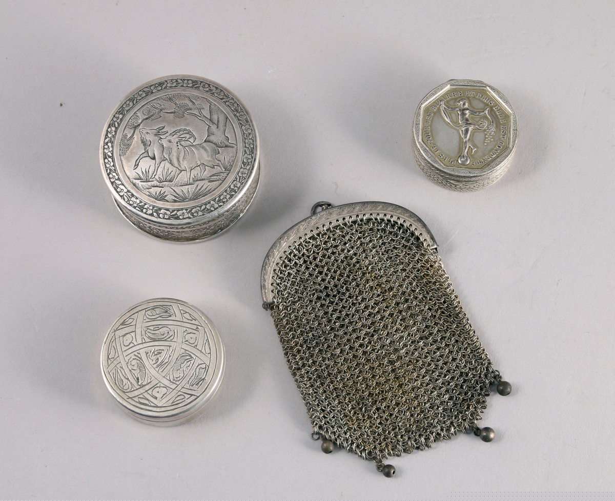 - BOÎTE de forme ronde à décor circulaire d'oiseaux dans des branchages fleuris. Le couvercle orné d'un couple de bouquetins sur fond paysagé. Le dessous à frises feuillagées. Travail étranger. Diam. 5 cm. Poids : 59 g.
