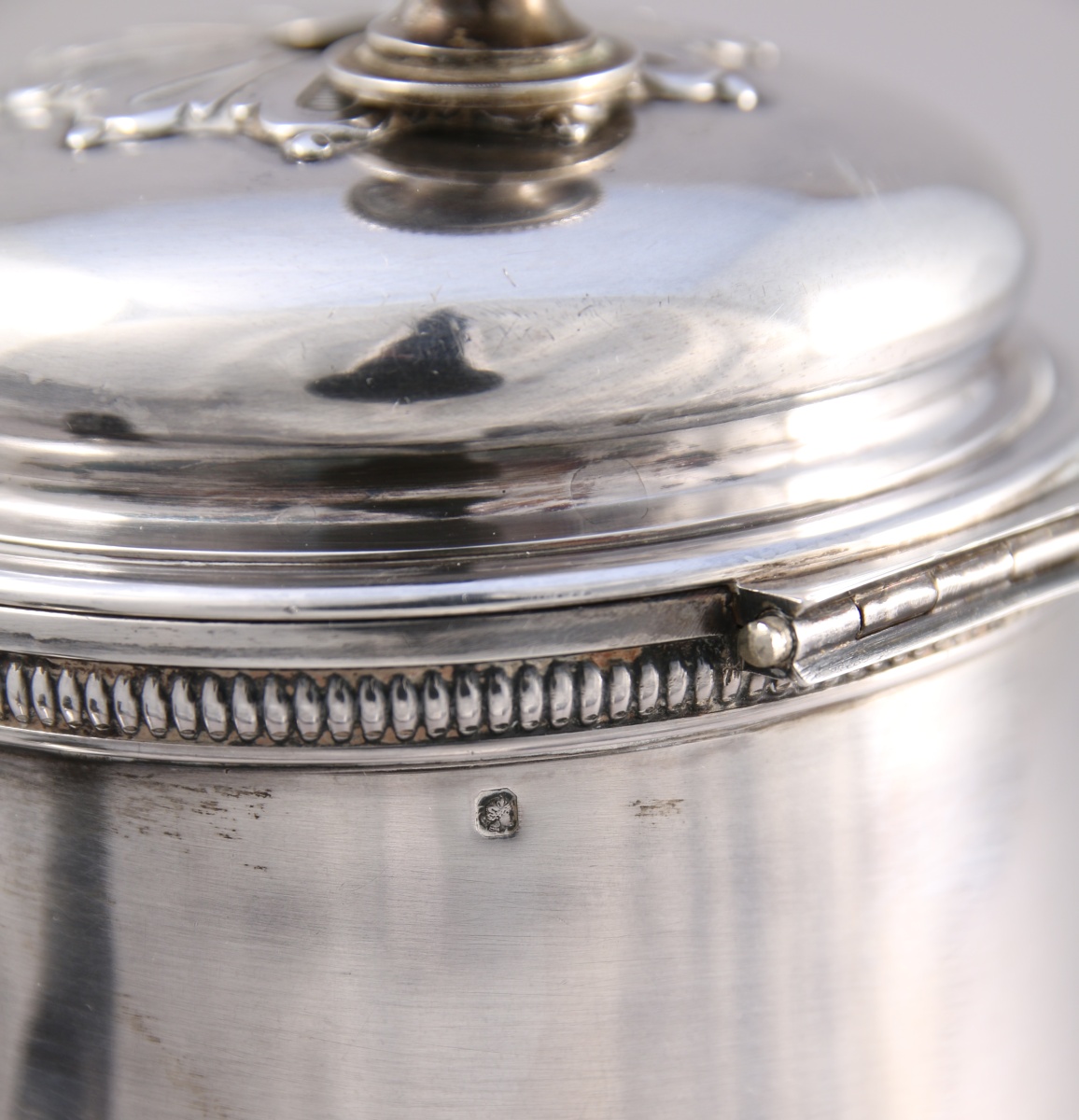 CHOCOLATIÈRE de forme tronconique en argent à décor de frises de godrons. Le corps monogrammé "AD". Bec verseur à décor d'une large coquille, agrafes feuillagées et godrons. L'orifice supérieur masqué par une toupie pivotante sur une terrasse fleuronnée. Manche latéral en ébène tourné. Elle repose sur un piédouche orné d'une frise de godrons.