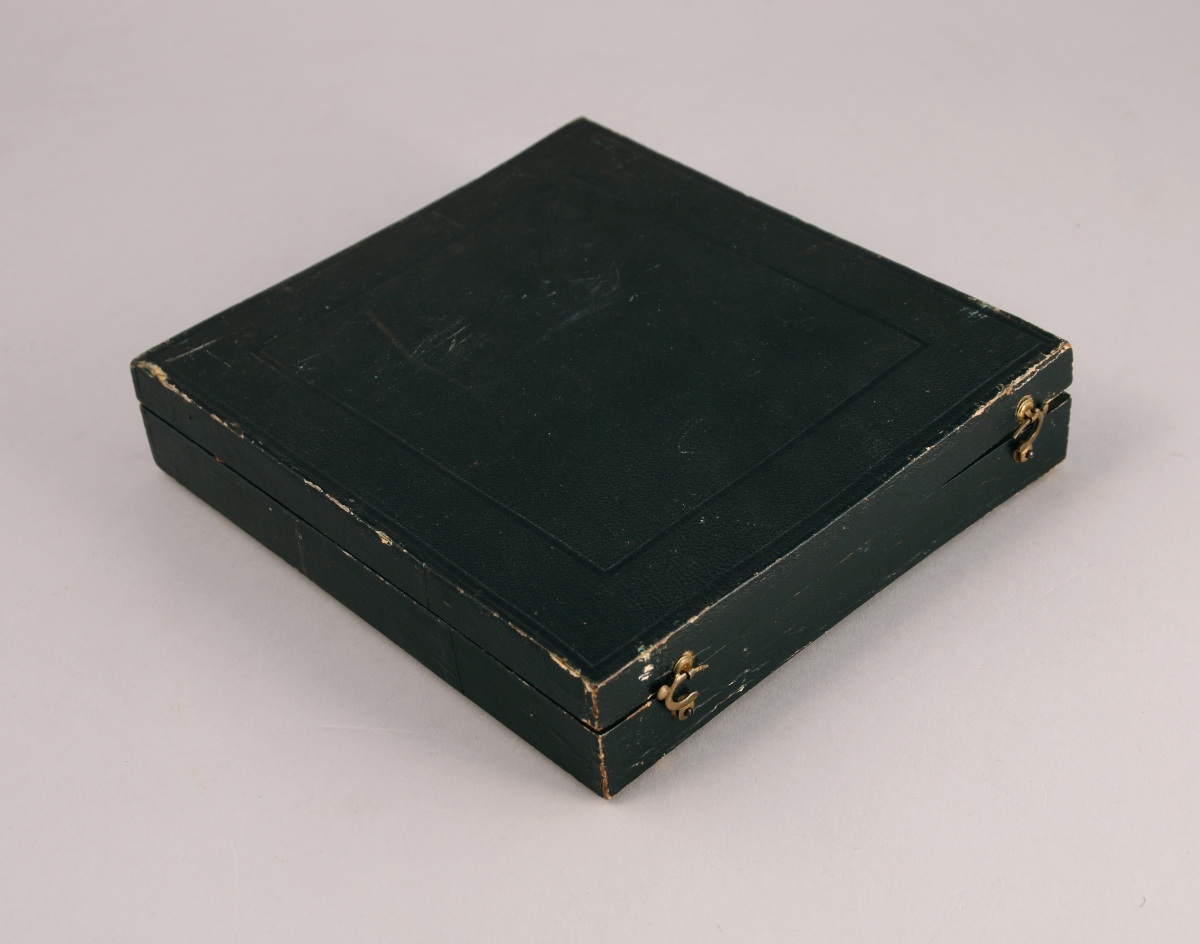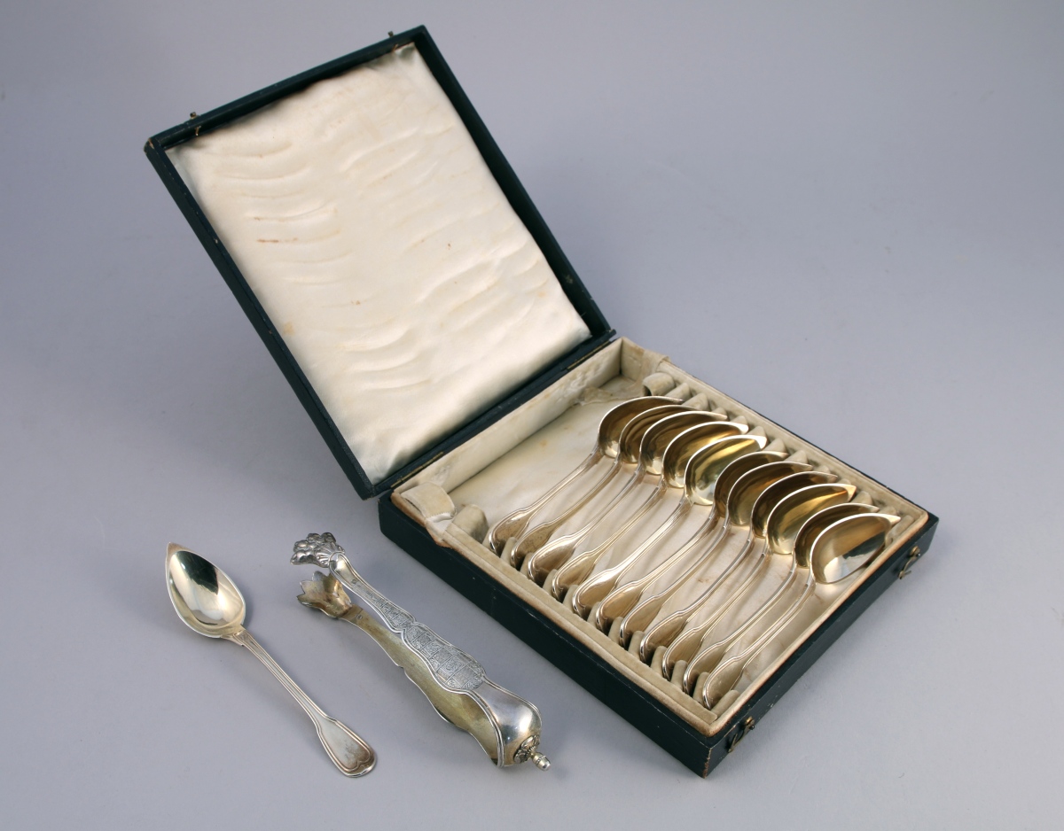 COFFRET contenant une suite de 12 CUILLÈRES À CAFÉ et une PINCE À SUCRE en vermeil. Les cuillères, modèle filets-contours, sont monogrammées "DB". La pince à sucre à pattes de lion présente un décor quadrillé orné de guillochis et d'acanthes stylisées. Elle est sommée d'un gland reposant sur une terrasse fleuronnée.