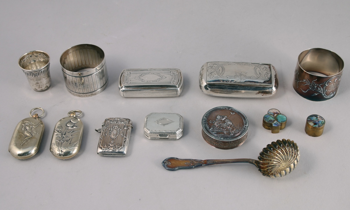 PETITE ARGENTERIE, NEUF PIÈCES : DEUX TABATIÈRES (l'une doublée), DEUX RONDS DE SERVIETTE, l'un monogrammé "NM", UNE petite CUILLÈRE À SAUPOUDRER; DEUX BOÎTES À PILLULES; un GOBELET À LIQUEUR et un PYROGÈNE.