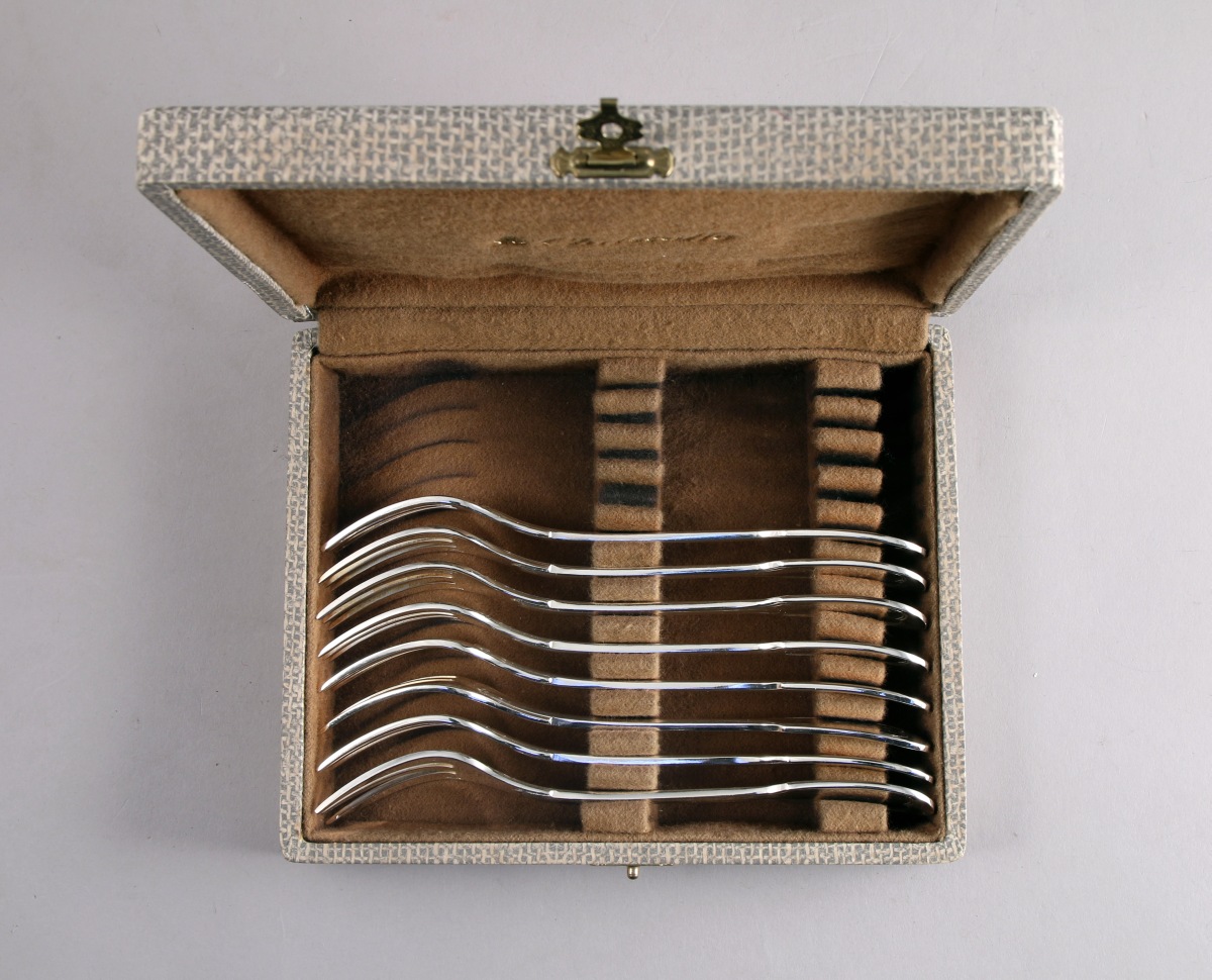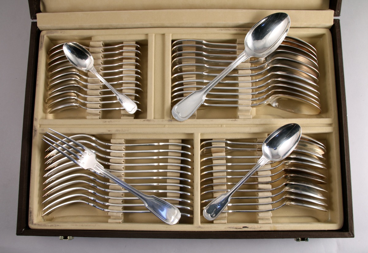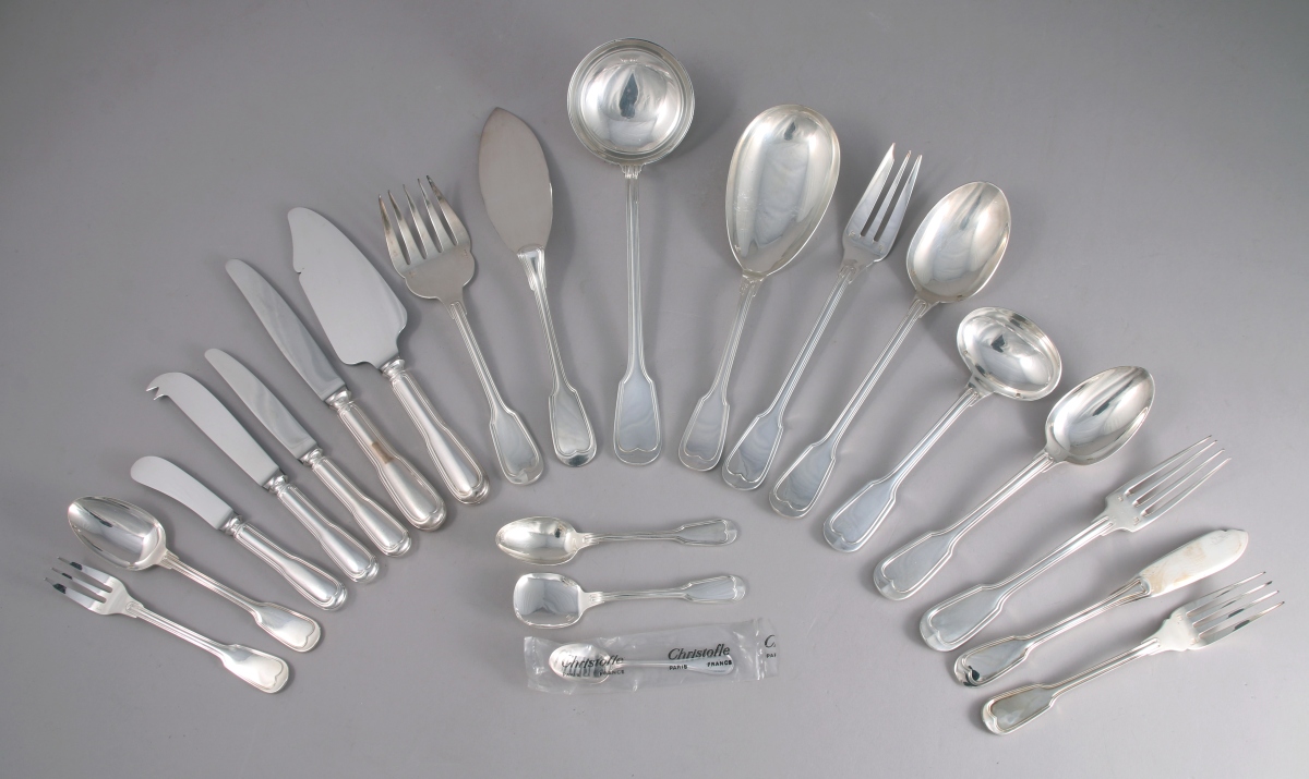 La MÉNAGÈRE, modèle filet-contours, se compose de 12 grands couverts, 12 grands couteaux, 12 cuillères à entremets, 12 couteaux à entremets, 12 fourchettes à poisson, 12 couteaux à poisson, huit fourchettes à gâteau, 12 cuillères à café, six cuillères à glace, deux cuillères à moka, un couteau et une fourchette de service à poisson, un couvert à salade, une louche, une pelle à riz, un couteau à beurre, un couteau à fromage, une cuillère à crème et une pelle à tarte.