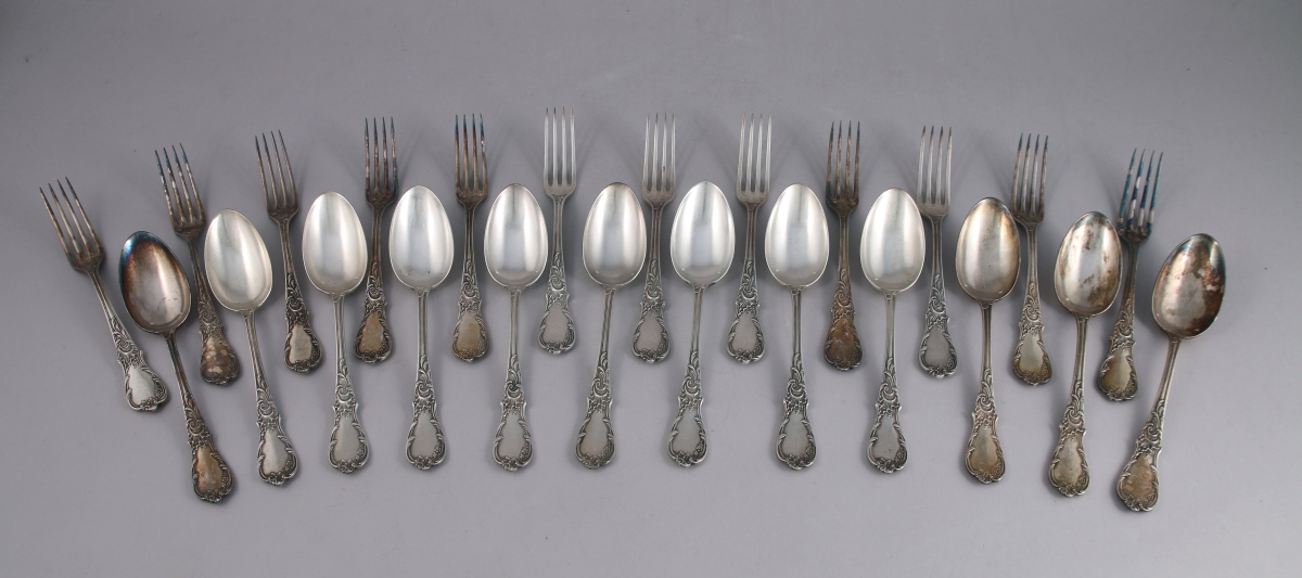 METAL ARGENTÉ, 67 PIÈCES : Suite de 12 COUVERTS, ornementation de style Louis XV; SEAU à RAFRAÎCHIR, petites anses godronnées. Haut. 18, Diam. 18 cm; PINCE À PETITS-FOURS; PELLE À FRAISES, manche en argent fourré; Suite de 12 FOURCHETTES À POISSON, modèle filets-contours; un SHAKER Ercuis; Suite de TROIS COUVERTS et d'une FOURCHETTE décor feuillagé et joncs rubanés; Suite de 10 CUILLÈRES À CAFÉ, décor fleuri et feuillagé; Suite de SIX CUILLÈRES À CAFÉ, manche à la russe; VERSEUSE, décor de style Louis XVI et TROIS CUILLÈRES À CAFÉ.