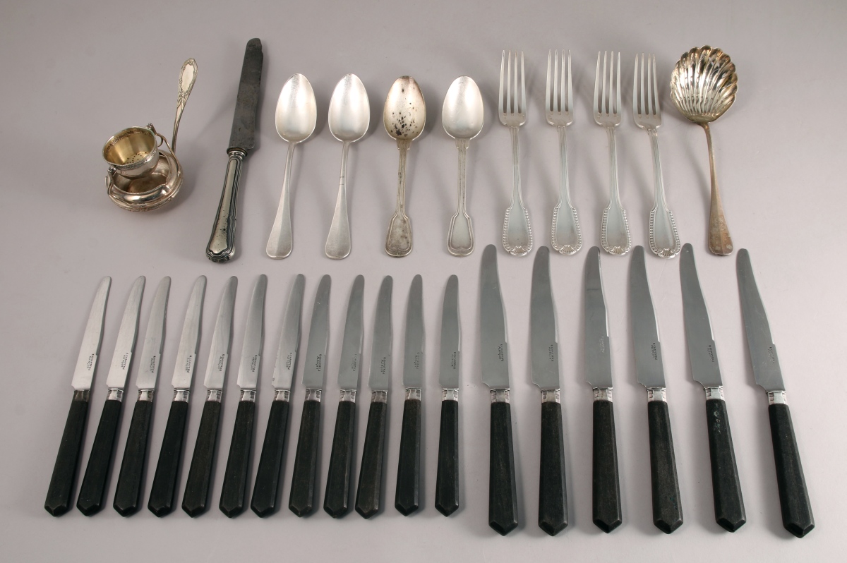 MÉTAL ARGENTÉ, 30 PIÈCES : suite de SIX COUTEAUX et 12 COUTEAUX À ENTREMETS, manche en bois noirci et virole géométrisante de style Art Déco; PINCE À SUCRE; CUILLÈRE À SAUPOUDRER; PASSE-THÉ; QUATRE FOURCHETTES; QUATRE CUILLÈRES à entremets; COUTEAU.