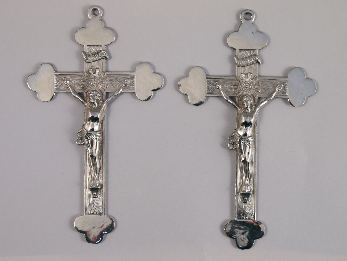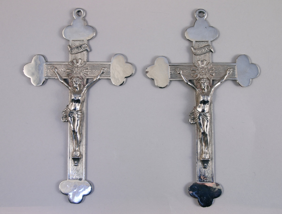 PAIRE de CRUCIFIX en métal argenté. Croix trefflée. Anneau de bélière.