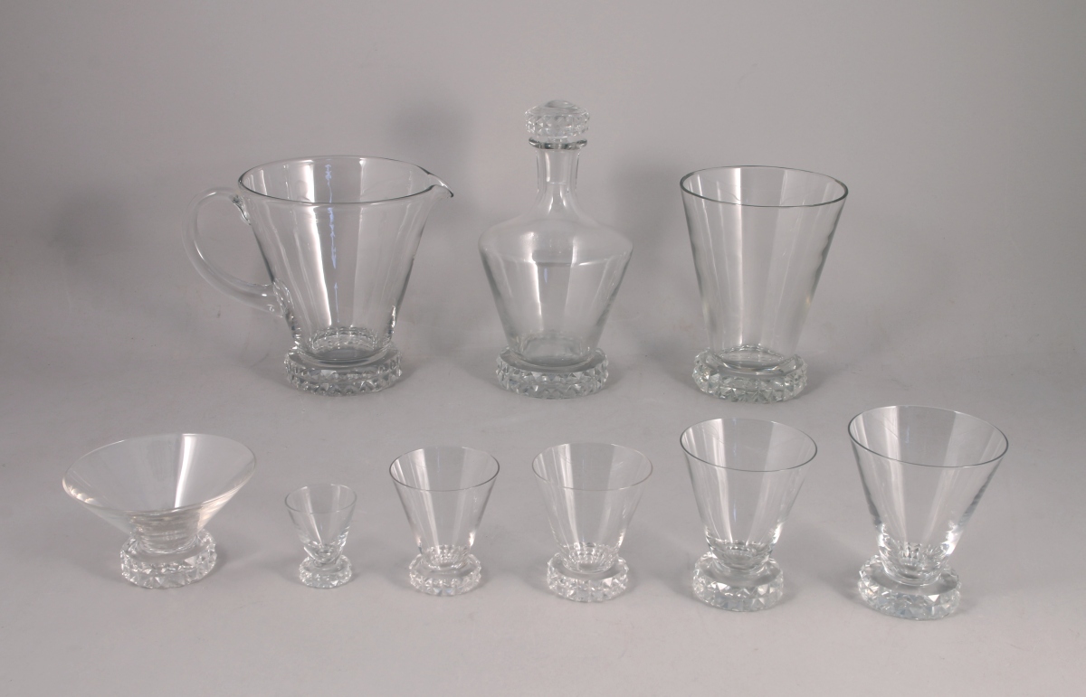 SAINT-LOUIS. Partie de SERVICE DE VERRES, 80 pièces, en cristal. Corps de forme tronconique reposant sur un pied circulaire à double frise de pointes de diamant. Il se compose de huit verres à eau, 15 verres à vin (dont quatre légèrement plus petits), 26 verres à porto, 15 coupes à champagne, 13 verres à liqueur, une carafe, un broc et un vase.