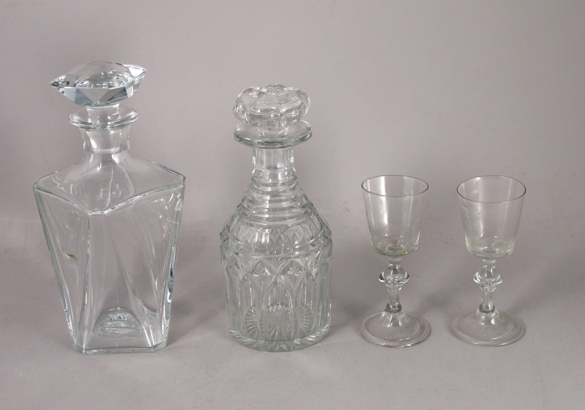 JOINT : deux CARAFES en cristal, une par BACCARAT à pans coupés, l'autre par SAINT-LOUIS à décor gravé d'arcades. En l'état.