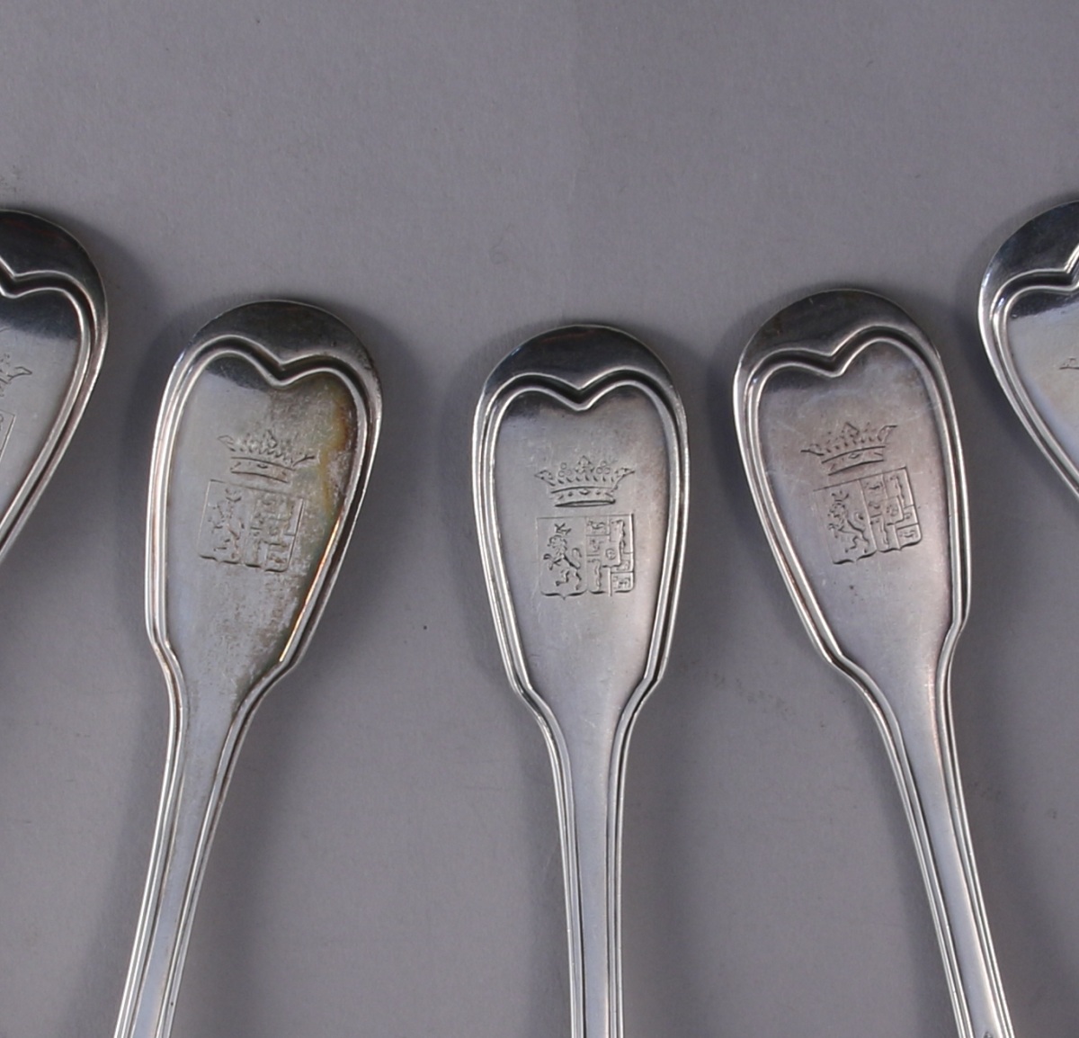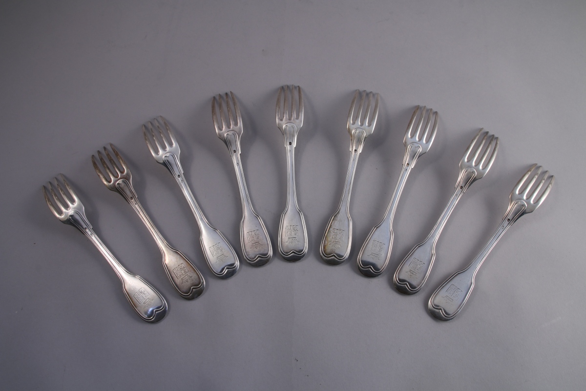 Suite de 9 FOURCHETTES, modèle filet-contour, en argent. Les spatules gravées d'armes d'alliance timbrées d'une couronne de marquis. Celles de senestre sont celles de la famille de La Motte Saint Pierre.