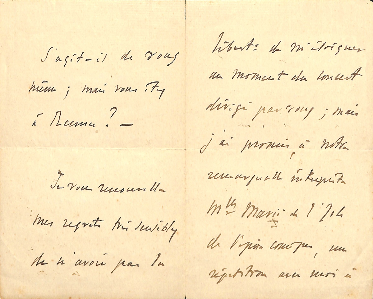 ) Je vous renouvelle mes regrets très sensibles de n'avoir pas la liberté de m'éloigner au moment du concert dirigé par vous ; mais j'ai promis à notre remarquable interprète Melle Marié de l'Isle de l'opéra-comique, une répétition avec moi à Paris, avant son départ (