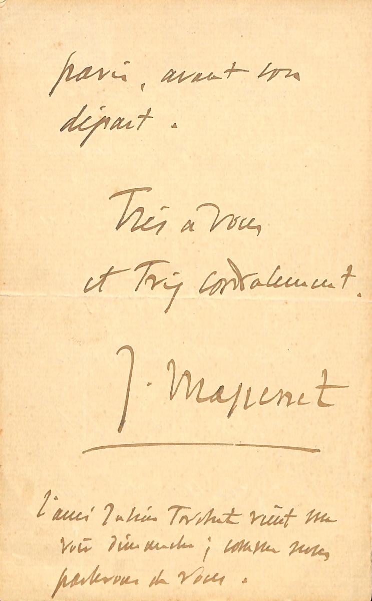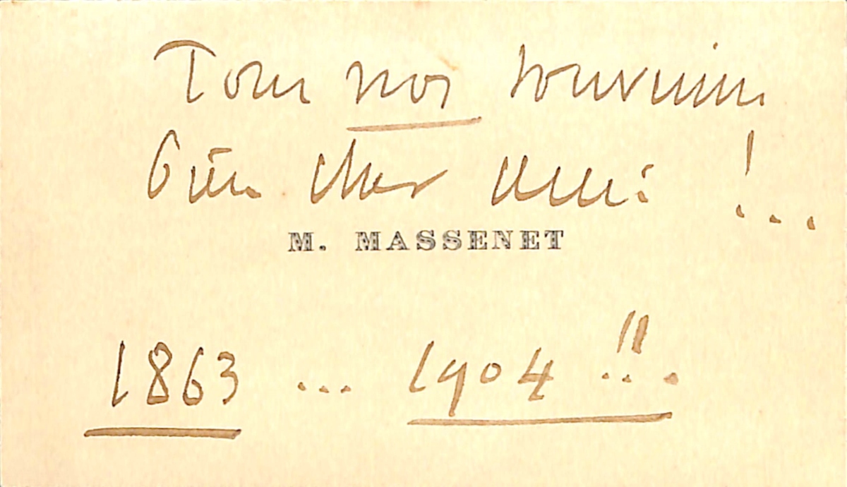 Joint une carte de visite, datée de 1904 avec mentions manuscrites de Massenet.