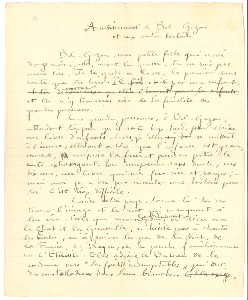PREFACE pour La Maison dans l'il du chat de Mireille HAVET (ill. de Jeanne de Lanux, Georges Crès, 1917). Le manuscrit présente des ratures et corrections.