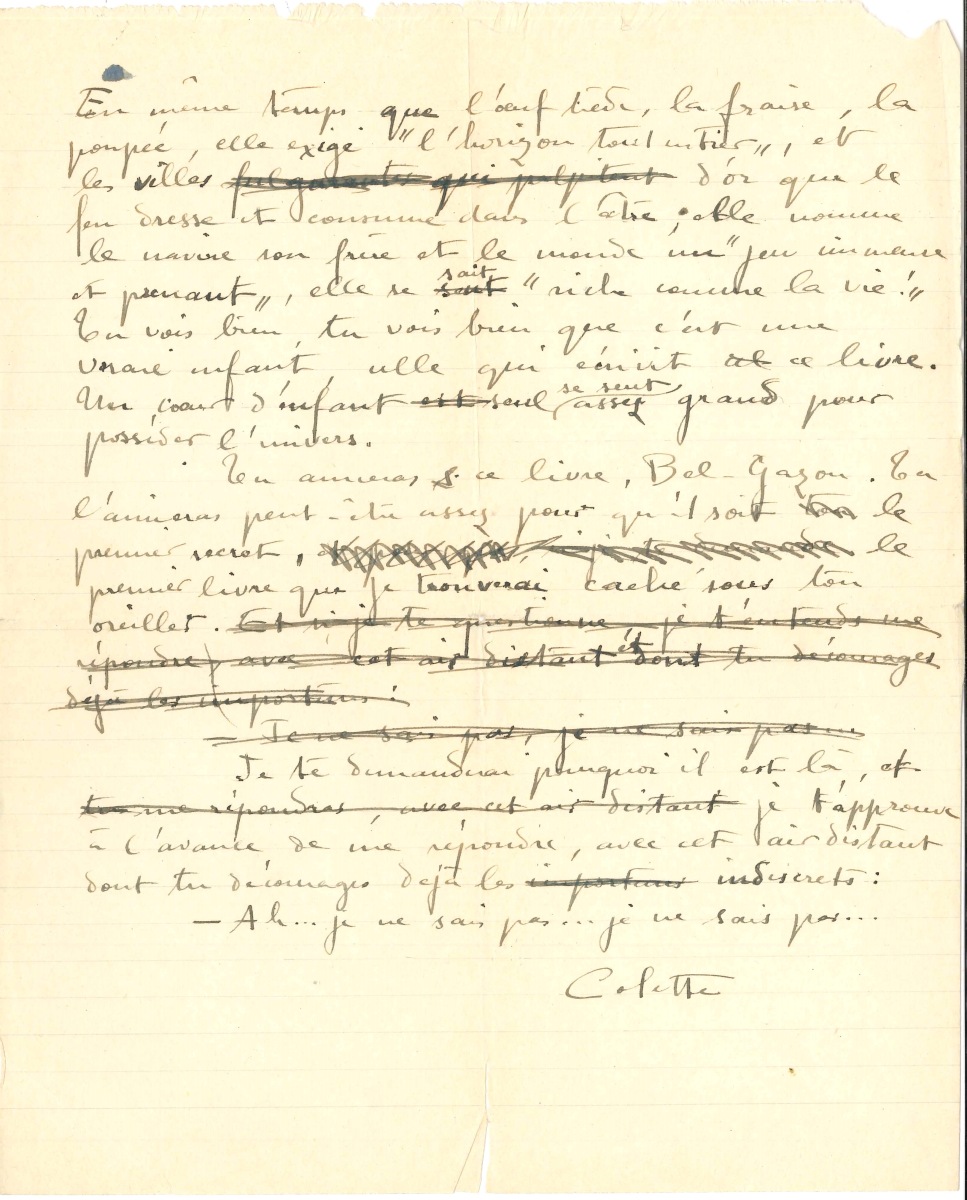 COLETTE. MANUSCRIT autographe signé, Avertissement à Bel-Gazou et aux autres lecteurs, [1917] ; 2 pages in-4.