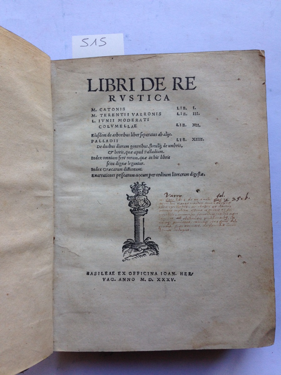 Edition bâloise peu courante, imprimée en italique, de cet ouvrage classique d'agriculture, copie fidèle de la seconde édition aldine publiée en 1533 -y compris dans la pagination (54 et 295 feuillets, plus un feuillet pour la marque).