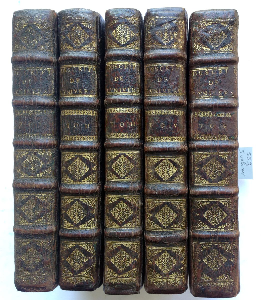 Bon exemplaire, absolument complet. Chaque volume porte le grand ex-libris gravé (XVIIème) d'A.C. de Sainte Marie, Marquis d'Auvers, alors propriétaire du château d'Equilly (Manche). Sur l'ex-libris du tome I, d'une écriture du temps, se trouve le décompte des gravures des 5 tomes.