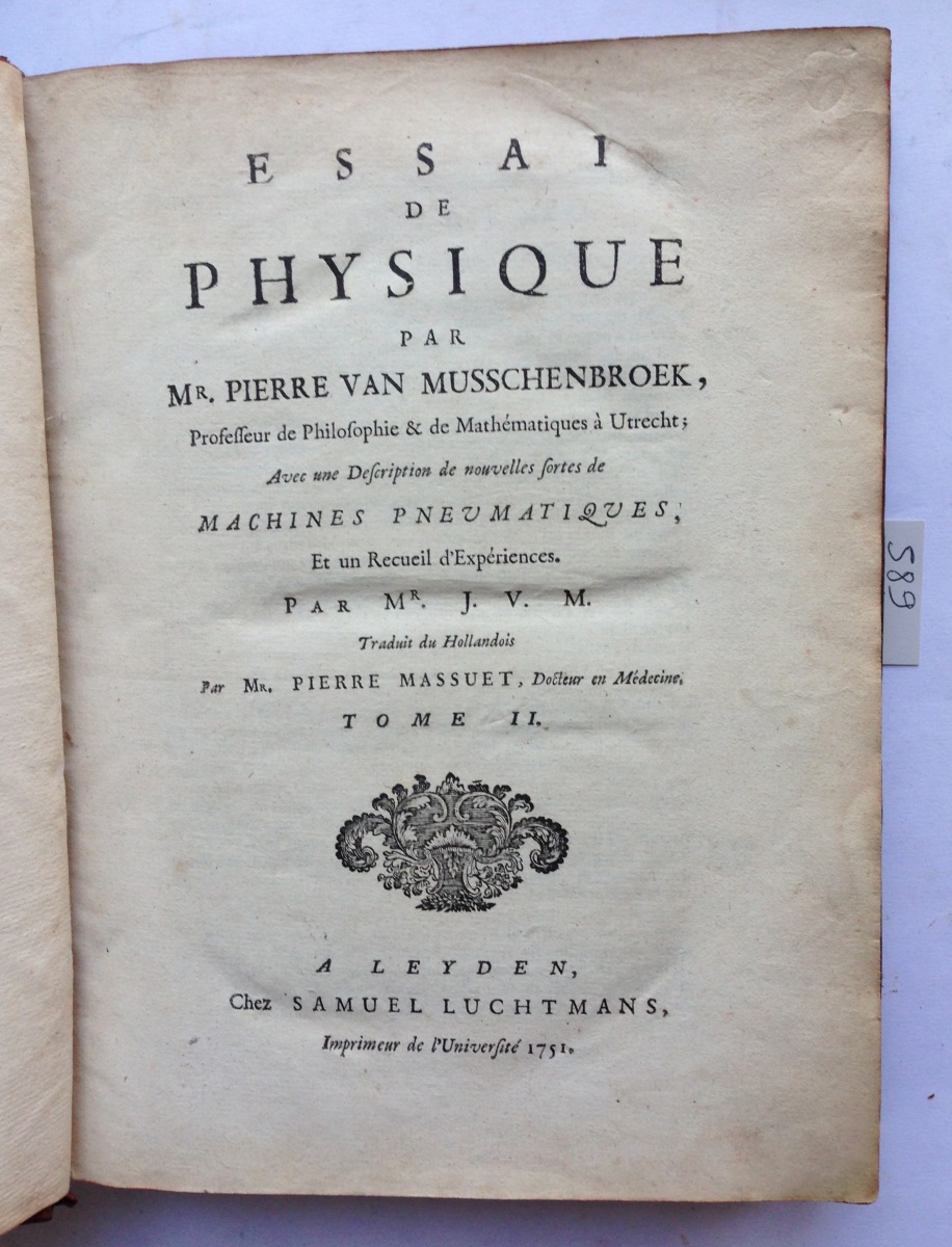 Essai de physique, par Pierre Van Musschenbroek, professeur de philosophie et de mathématiques à Utrecht. Avec une description de nouvelles sortes de machines pneumatiques et un recueil d'expériences par Mr. J.V.M.. Traduit du hollandais par Mr. Pierre Massuet, docteur en médecine.