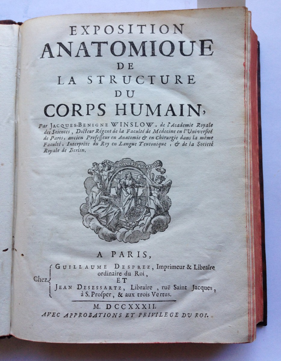 Edition originale de cet important ouvrage, illustré de 4 planches dépliantes. Jacques Bénigne Winslow (1669-1760) professeur d'anatomie et de physiologie au Jardin du Roi, est considéré comme le fondateur de l'anatomie descriptive. (Garrison and Morton, 394 et 1314).