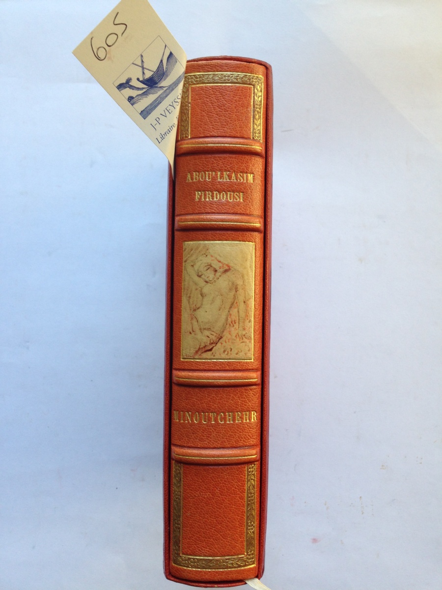 In-4°, plein maroquin orange, encadrement d'une roulette poussée sur une bande de maroquin bleu-nuit ; large décor central de fers dorés dans lequel s'inscrivent des motifs de fleurs mosaïquées. Dos à quatre nerfs, les compartiments de tête et de queue bordés de trois côtés d'une roulette poussée sur une bande de maroquin olivâtre ; le compartiment central orné d'une illustration en couleurs représentant une femme alanguie. Tête dorée. Large bande de maroquin intérieur, encadrée de deux filets droits se joignant dans les angles par un motif mosaïqué de fleur. Doubles gardes. Etui bordé de maroquin cerise. Couvertures et dos conservés. Reliure du temps signée E. Berthet. (Peut être Etienne Berthet, relieur à Valence, de 1895 environ à 1935).