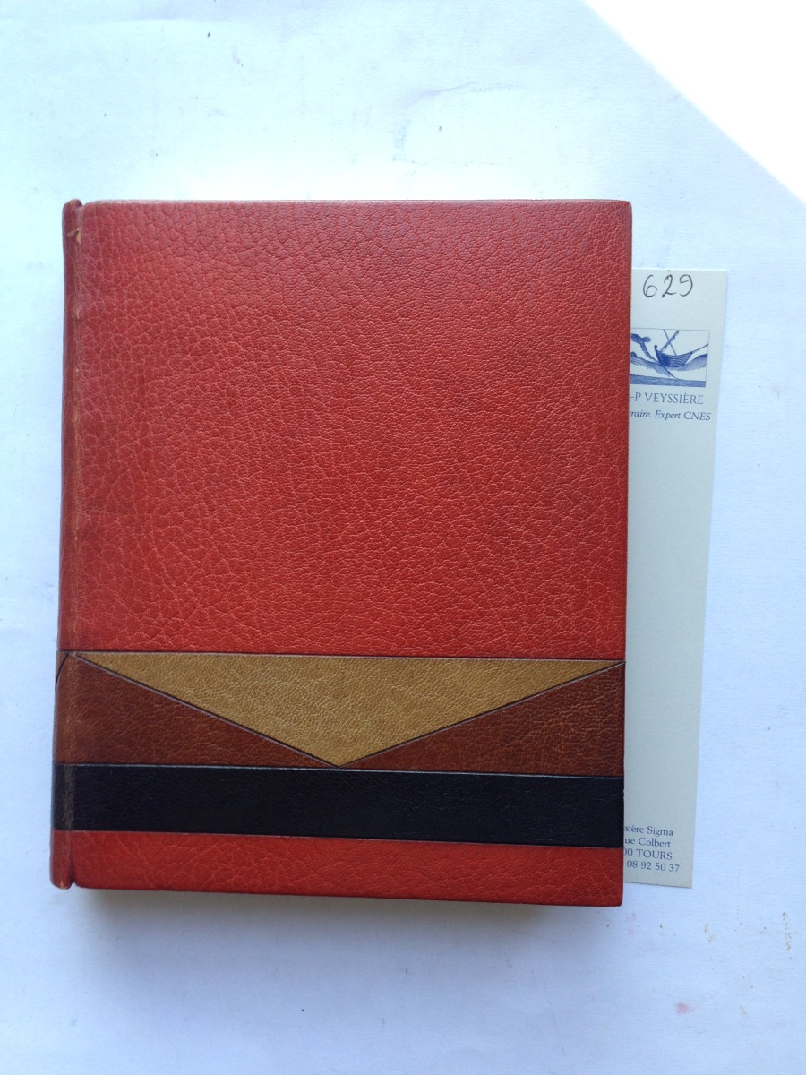 Petit in-4°, 267 pages, (3 ff). Couvertures conservées.Plein maroquin à gros grains orange ; large décor géométrique dans la partie inférieure, composé de maroquin noir, de maroquin havane clair et de maroquin havane foncé. Doubles gardes. Tête dorée. Etui aux coupes bordées de maroquin. Reliure du temps signée Madeleine Gras. (Dos légèrement empoussiéré).