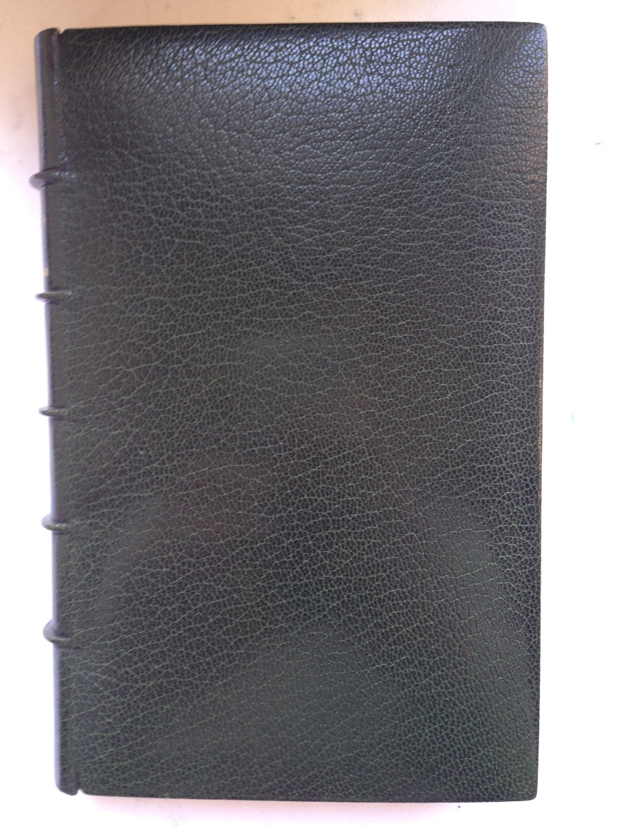 In-12, maroquin janséniste vert bouteille, dos à 5 nerfs très fins, deux filets droits sur les coupes ; doublure bord à bord de maroquin vert bouteille. Gardes de soie moirée vert tilleul. Tranches dorées sur témoins. Couvertures et dos conservés. Chemise à dos et rabats de maroquin vert bouteille ; étui bordé de maroquin avec feutrine intérieure. Reliure signée P.L. Martin. (Dos des couvertures doublé. Dos de la chemise insolé. ).